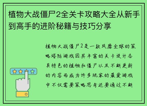 植物大战僵尸2全关卡攻略大全从新手到高手的进阶秘籍与技巧分享